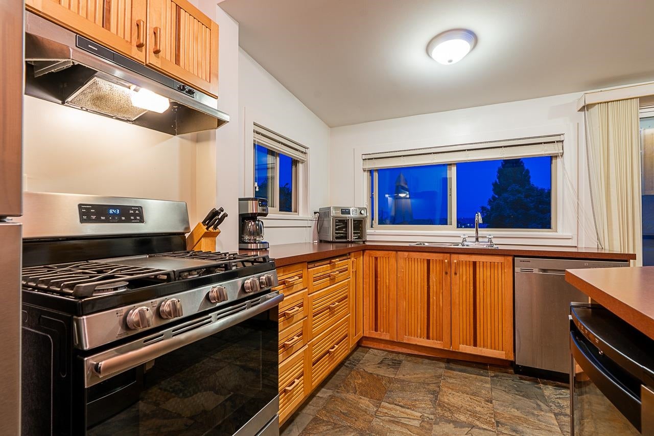 Charming character in law suite home on a generous lot with breathtaking water and mountain views from an expansive sundeck. Enjoy a private backyard retreat complete with lush landscaping and ample space for entertaining. Recent updates include windows, kitchen, 240 sq. ft. deck, hot water tank, furnace, and exterior improvements. Featuring maple cabinetry, slate flooring, and panoramic views from the kitchen. Additional highlights include garage with lane access, and a quiet, family-friendly location. Just minutes to shops, transit, schools, parks, and recreation—this home offers the perfect blend of charm and convenience in one of New Westminster’s most sought-after neighbourhoods.