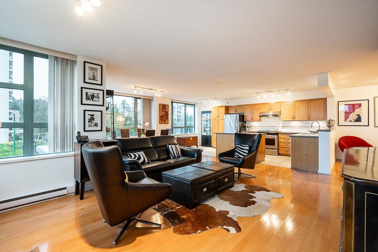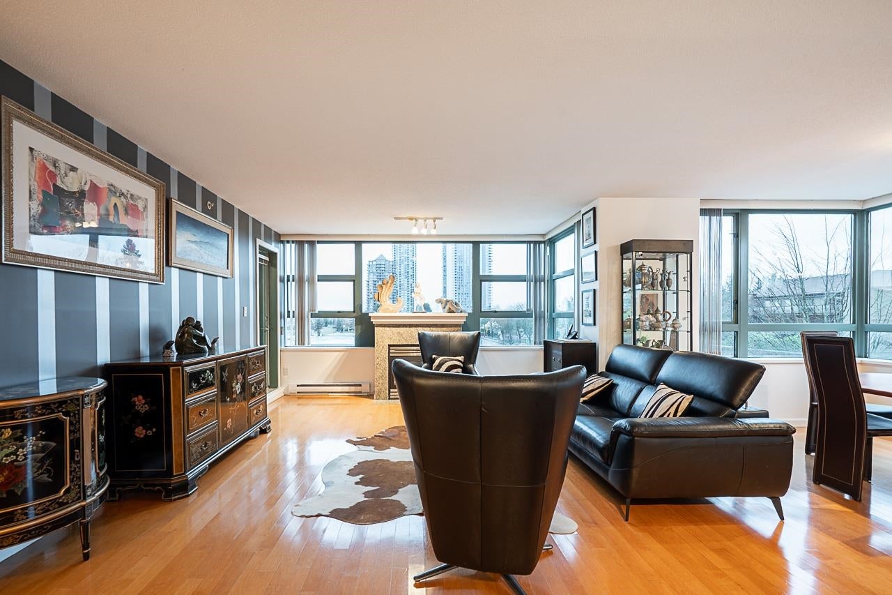 Welcome to this stunning northwest corner suite in Burnaby North. This bright home offers one of the best layouts in the building with excellent natural light throughout. Features include an updated kitchen with island and granite countertops, real hardwood floors, an open concept living and dining area, and a cozy gas fireplace. The suite offers 2 bedrooms, 2 bathrooms, balcony, and 2 parking stalls. Convenient third floor access to the gym, hot tub, sauna, steam room, and large outdoor terrace. Steps to Save On Foods, Winners, Brentwood Town Centre, and SkyTrain. A must see home in a great building.